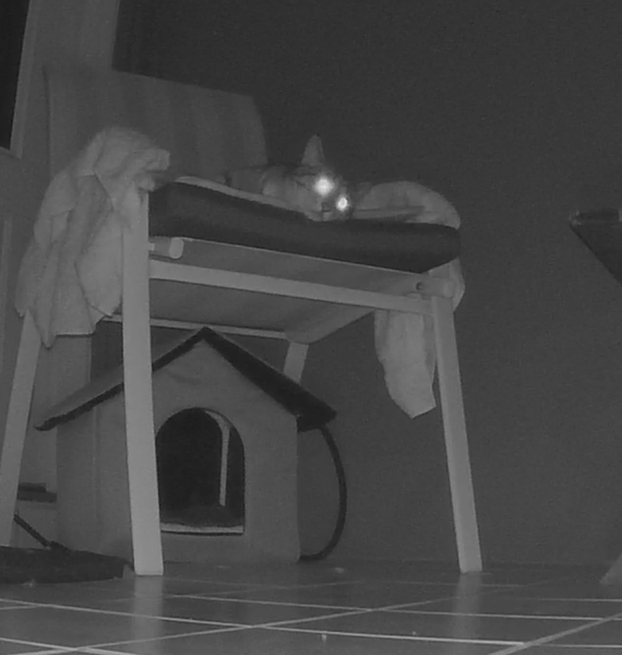 We set up a little cat cam to watch her, and her eyes glow at night, which