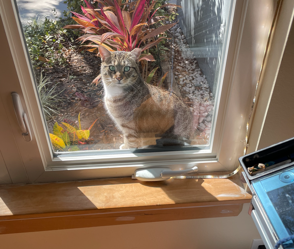 As for cat pictures... here's the outdoor cat, summoning me for Affection Time. She will jump up here when she's either hungry or lonely... if the latter, she just wants